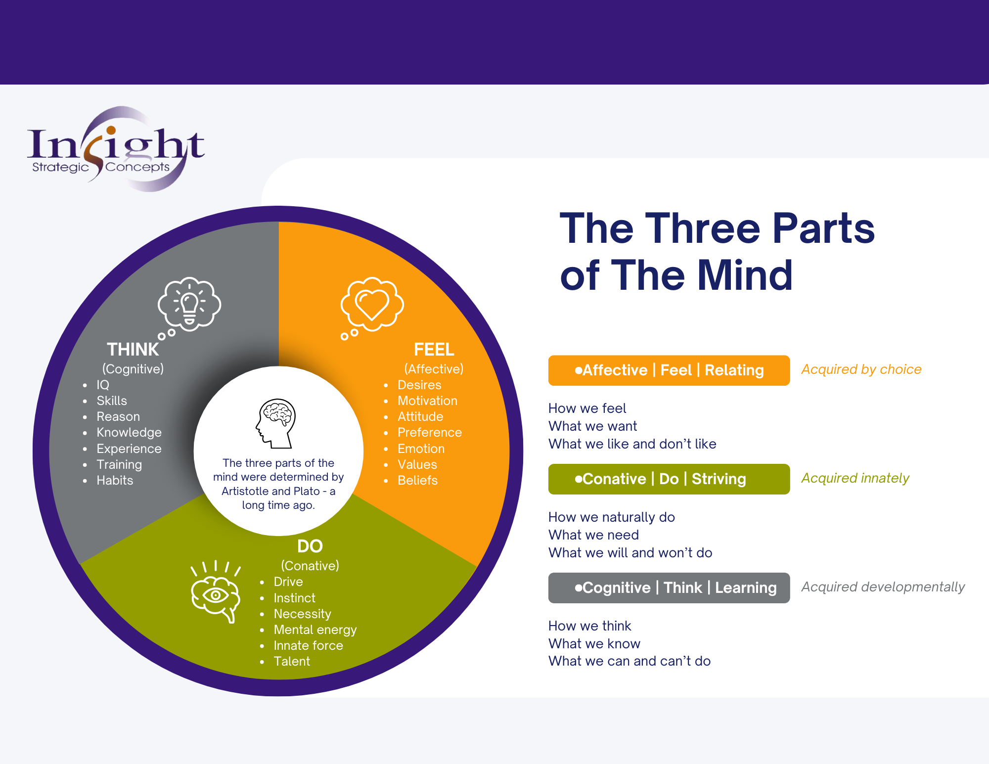 Long ago, experts in the field of psychology (Plato, Aristotle, etc.) determined that there are three parts of the mind that we each have. These three parts make up our whole person. These three parts represent how we feel, do, and think during our individual creative processes. Learn more to optimize your performance!