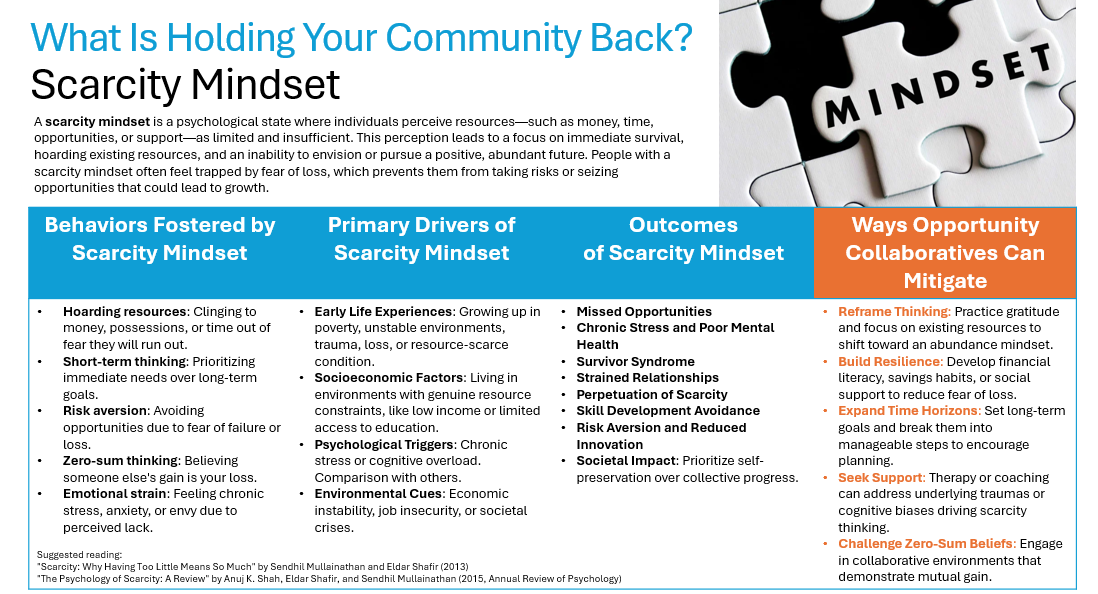 In working with communities that have struggled for decades to make ends meet with limited resources, there is a significant hurdle to overcome: the perception that more is not possible. The scarcity mindset and survivor syndrome are distinct psychological concepts, though both involve stress responses and can influence behavior in challenging environments.